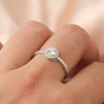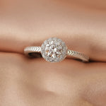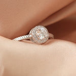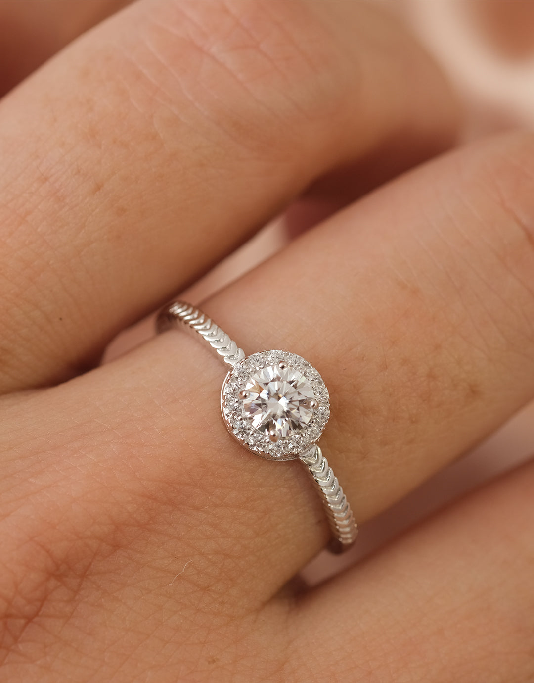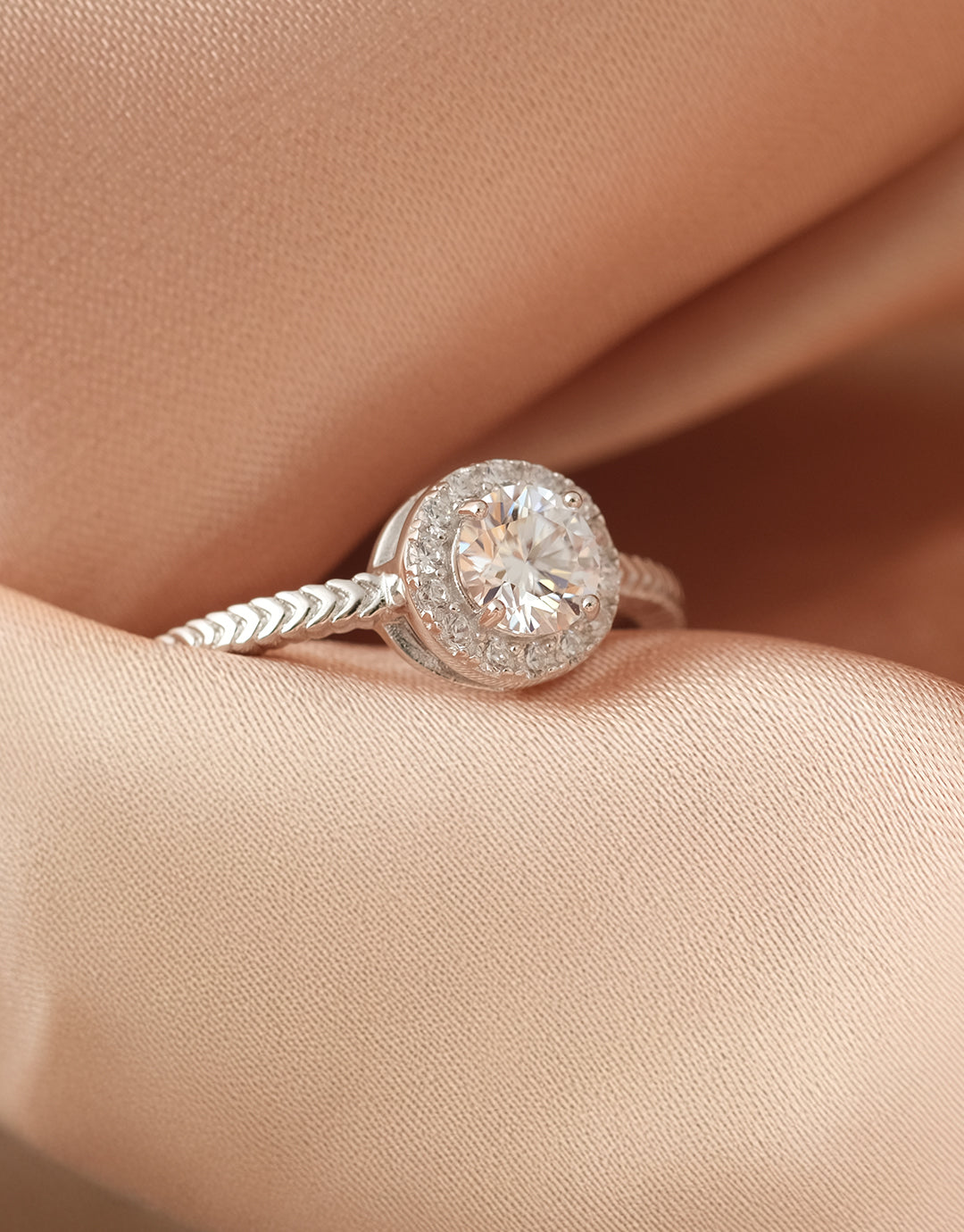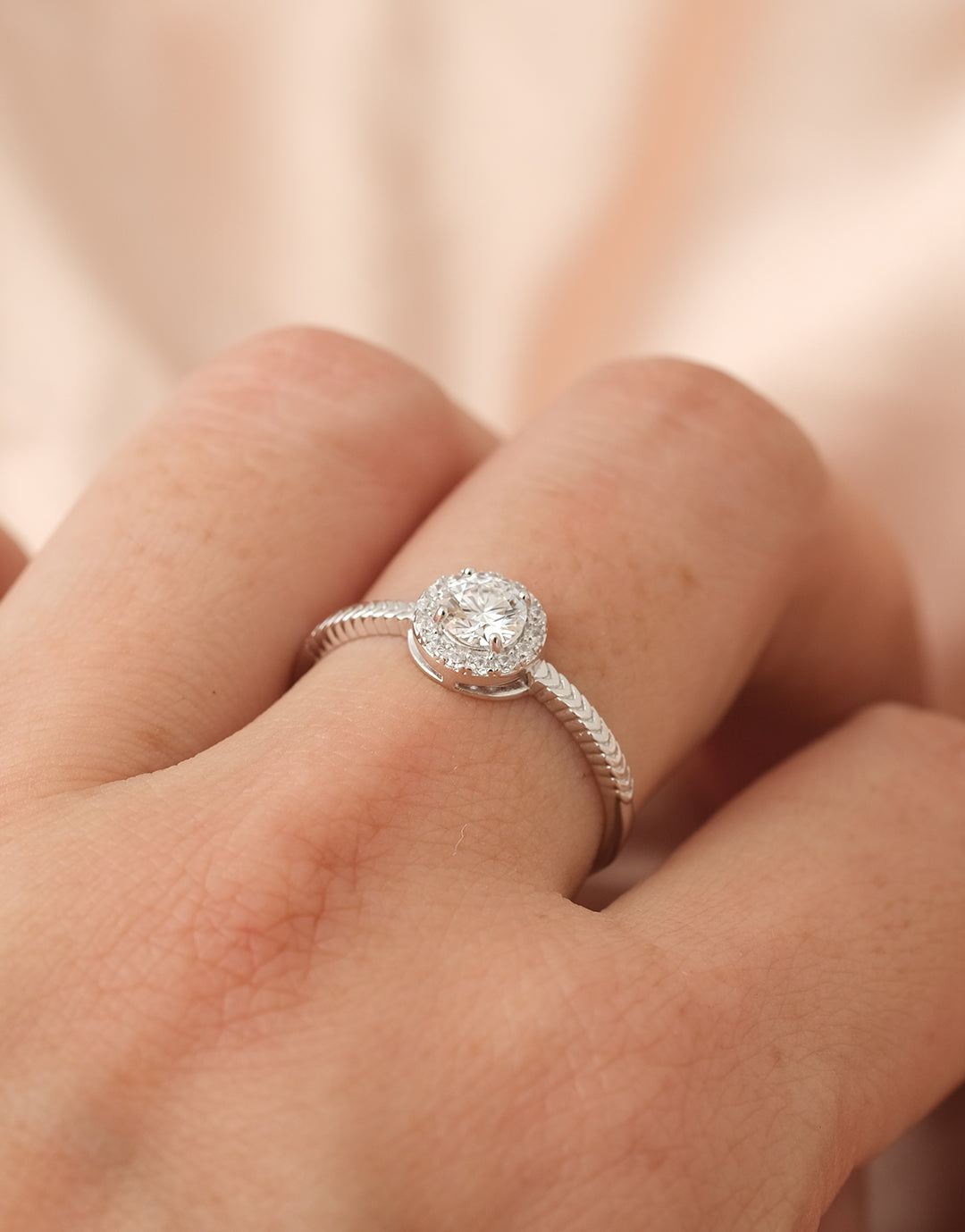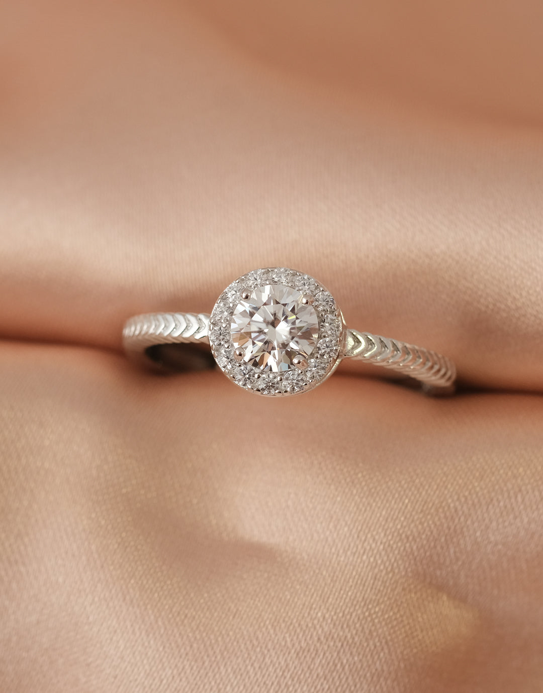 Celeste Halo 戒指以一顆璀璨圓形鋯石為主體,外圈鋯石光環細緻閃爍,展現柔亮而高雅的光芒。戒圈採用 法式編織靈感 的人字紋紋路,質感細膩、層次優雅,流露精緻格調,同時帶有的經典紋路氣場。